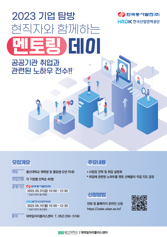[2023 기업 탐방 멘토링데이 – 한국산업인력공단편] *기업탐방과 더불어 구내식당 점심도 제공 1) 모집개요 ○ 대상 : 울산대학교 재학생 및 졸업생 (2년 이내) ○ 인원 : 선착순 40명 (*대기 인원 30명 초과 시 모집 인원 추가 예정) ○ 일자 : 2023.04.10 (월) 10:00 ~ 12:30 / 울산대학교 출발 (09:25) - 한국산업인력공단출발 (*식사제공/12:30) 2) 주요내용 ○ 사업장 견학 및 취업 설명회 ○ 사내 구내식당 점심식사 제공 ○ 취업에 관련된 노하우를 현직자 멘토 선배들이 직접 지도 공유 3) 신청방법 ○ 전화 및 유스타(홈페이지 신청 https://ustar.ulsan.ac.kr/ko/program/ALL/view/1215) ○ 문의 : 052-220-5749
