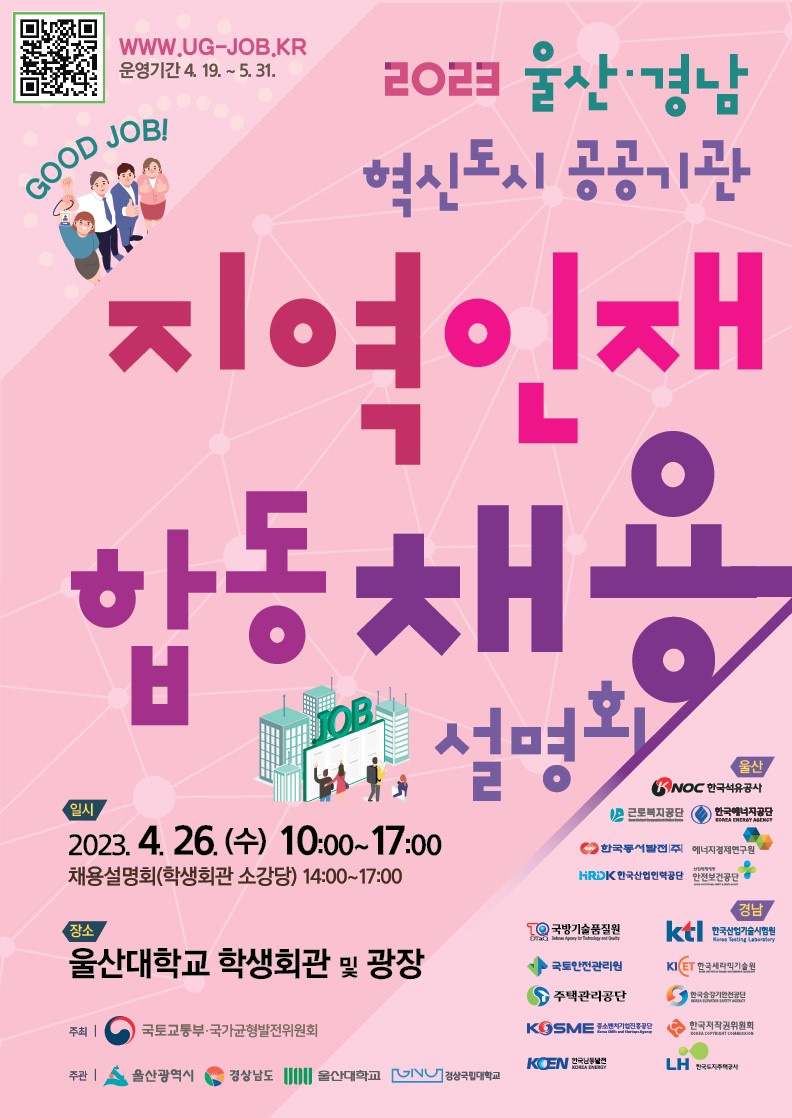2023 울산·경남 혁신도시 공공기관 지역인재 합동채용 설명회 안내 1. 일시 및 장소 가. 채용 설명회: 2023. 4. 26.(수) 14:00~17:00 / 학생회관 소강당 나. 기관별 채용 안내 부스: 2023. 4. 26.(수) 10:00~17:00 / 학생회관 광장 2. 참여기관: 울산·경남 이전 공공기관 등 17개 기관 3. 참가대상: 울산대학교 재학생 및 졸업생, 지역 청년 4. 채용 설명회 사전신청 가. 사전신청 접수 일정: 2023. 4. 24.(월) 13시까지 나. 사전신청 방법: 울산대학교 비교과 통합 홈페이지를 통해 신청 ※ 링크: https://ustar.ulsan.ac.kr/ko/program/ALL/view/1259 5. 채용 설명회 세부 일정: 첨부파일 참조