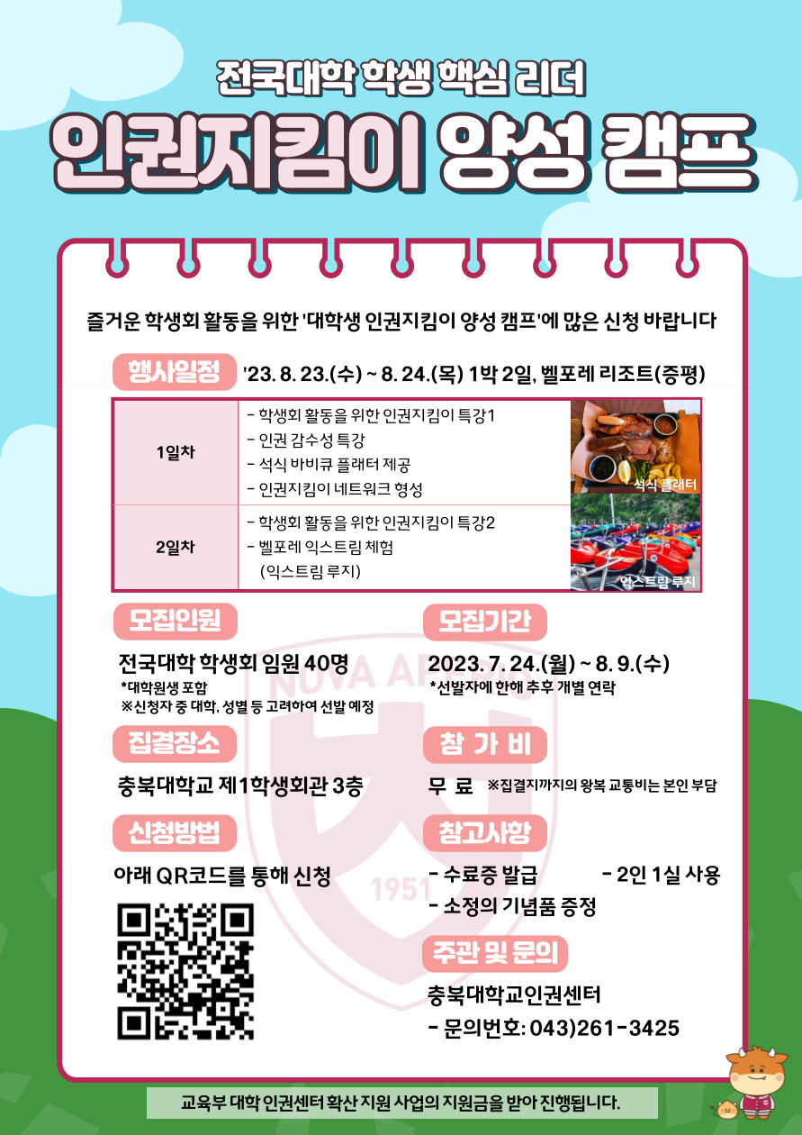1. 행사기간: 2023. 8. 23.(수) ~ 8.24.(목) 2. 행사장소: 벨포레 리조트(충북 증평군 소재), 숙소 2인 1실 3. 집결장소: 충북대학교 제1학생회관 3층 '소극장 터' 4. 주요내용: 인권지킴이 특강 및 인권감수성 특강, 인권지킴이 네트워크 형성, 벨포레 익스트림 체험 등 5. 모집인원: 전국대학 학생회 임원 및 재학생(대학원생 포함) 등 40명 내외 6. 모집기간: 2023. 7. 24.(월) 9:00부터 8. 9.(수) 17:00까지 7. 참가방법: 구글 폼 접수 * 신청 폼 바로가기: https://forms.gle/KoEbQEer5wSTPGba7 8. 참 가 비: 무료 ※집결지까지의 왕복 교통비는 본인 부담 9. 주 관: 충북대학교인권센터(043-261-3425) ※본 행사는 교육부 「2023년 대학 인권센터 확산 지원 사업」의 일환으로 진행됩니다.