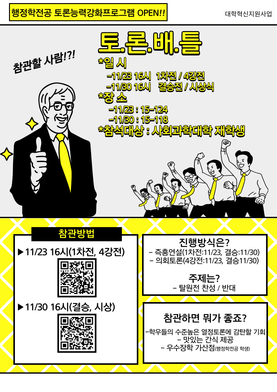 [토론능력강화 프로그램 "토론배틀" 참관 신청공지] 행정학전공에서 대학혁신지원사업 프로그램으로 진행하는 <토론배틀> 참관신청을 신청 공지 입니다. *분야: 의회토론(팀전)과 즉흥연설(개인전) *일시장소 -11/23: 16시~, 15-124 -11/30: 16시~, 15-118 *상금: 약60만원, 30만원 *참석대상: 사회과학대학 재학생 ✔내년에도 진행 될 수 있으니 토론에 관심이 있거나 추후에 지원할 생각이 있는 학생들은 한번 참관에 보시기를 권장드립니다. ✔참석학생들에게는 간식이 제공될 예정이니 많은 관심 부탁드립니다(방긋) ✔세부사항은 포스터를 참고해 주시기 바랍니다! *신청기간 -9/25 : ~11/20까지 -11/30 : ~11/27까지 *신청방법: 네이버폼, QR -9/25 (https://naver.me/FUzGjmML) -11/30 (https://naver.me/5ewAPIZU)