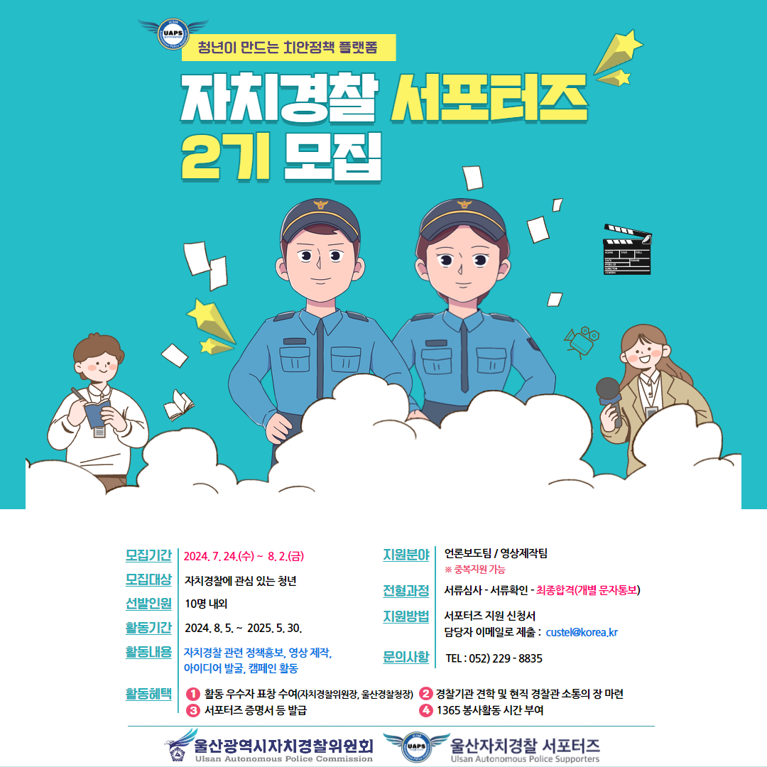 울산광역시자치경찰위원회가 주관하는 '자치경찰 서포터즈' 2기를 모집합니다. 관심 있는 법학과 학생들의 많은 참여 부탁드립니다. 1. 모집기간 : 2024. 7. 24. (수) ~ 8. 2. (금) 2. 모집대상 : 자치경찰에 관심 있는 청년 3. 활동기간 : 2024. 8. 5. (월) ~ 2025. 5. 30. (금) 4. 활동내용 : 자치경찰 관련 정책홍보, 영상 제작, 아이디어 발굴, 캠페인 활동 등 5. 지원방법 : 서포터즈 지원 신청서를 담당자 이메일로 제출 (custel@korea.kr) 기타 자세한 사항은 아래 포스터 참조 부탁드립니다.