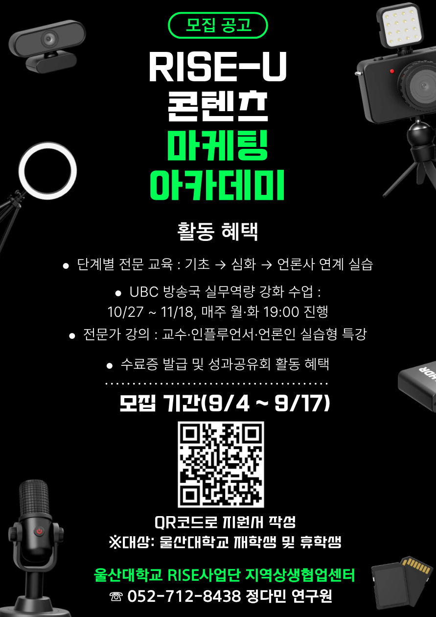 콘텐츠 기획부터 마케팅까지, 한 번에 끝낸다! ★ RISE-U 콘텐츠 마케팅 아카데미 2기 모집 ★ ※ 기초 → 심화 → 실무 연계까지 이어지는 단계별 교육 ※ UBC 방송국 PD와 함께하는 실무 수업 (10/27~11/18, 매주 월·화 19시) ※ 교수·인플루언서·언론인과 함께하는 실전 특강 ※ 수료증 발급 + 성과공유회 기회까지! * 모집기간: 9/4 ~ 9/17 * 대상: 울산대학교 재학생 및 휴학생 * 지원양식은 QR코드나 링크로 확인! ☏문의: RISE 지역상생협업센터 정다민연구원 (052-712-8438)
